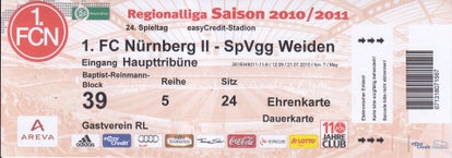 Alte Eintrittskarte zum Regionalliga Spiel 1.FCN II - SpVgg Weiden aus dem Jahr 2010. Keine Einrisse oder Beschädigung. Block 39 Reihe 5 Platz 24 und 25
