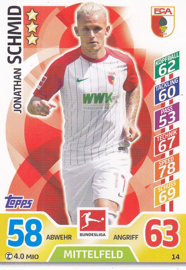 Jonathan Schmid / FC Augsburg / Topps Match Attax 2017 / Basis Karte / Nr. 14