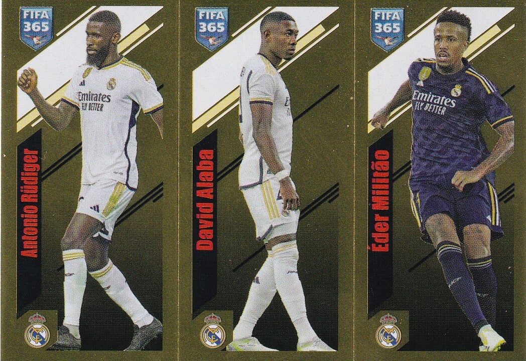 Antonio Rüdiger & David Alaba / Eder Militäo / Real Madrid / Panini Fifa 365 Jahr 2024 / Gold Triple / Nr. 167a 167b 167c