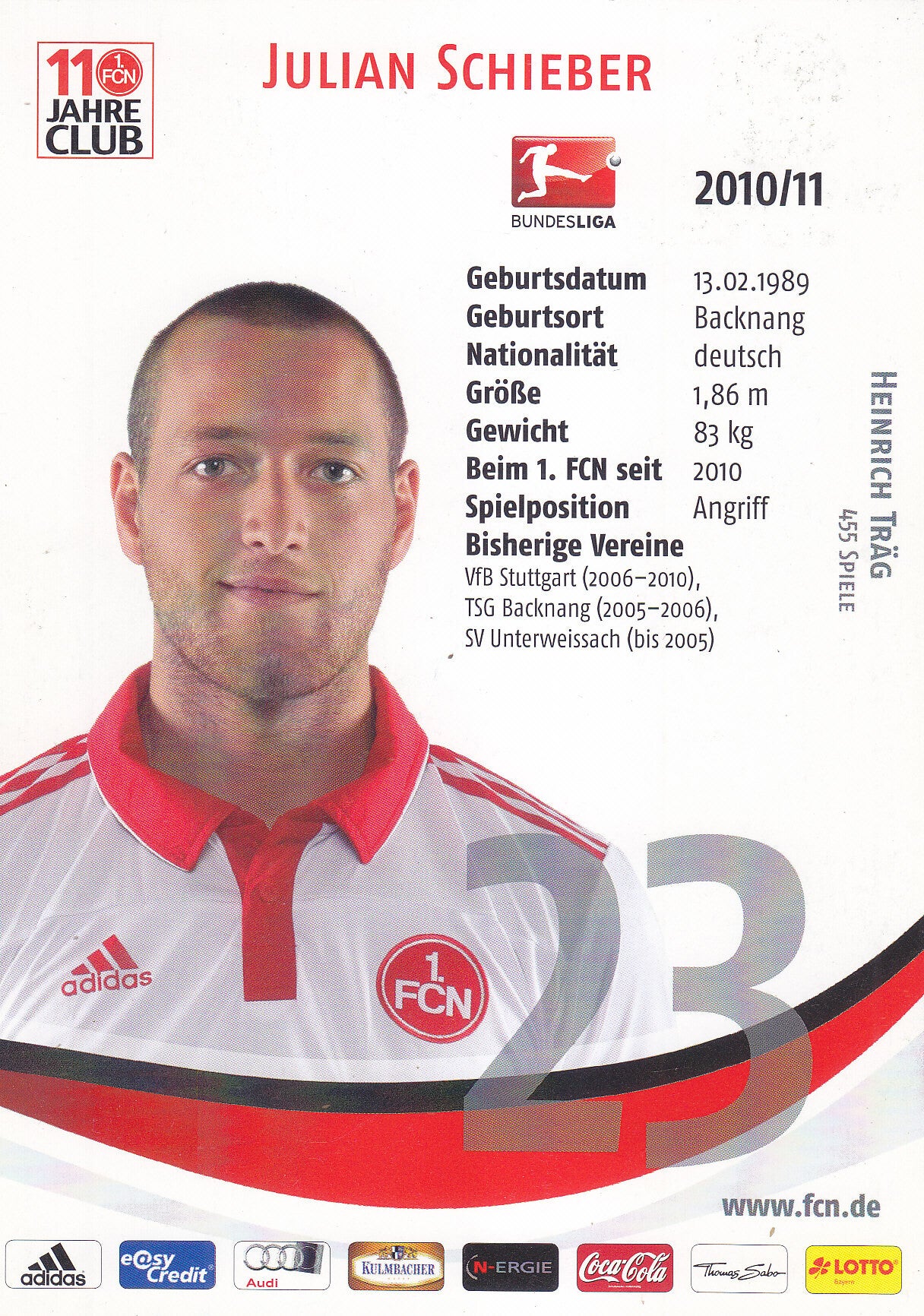 Julian Schieber - 1.FC Nürnberg - Autogrammkarte 2010