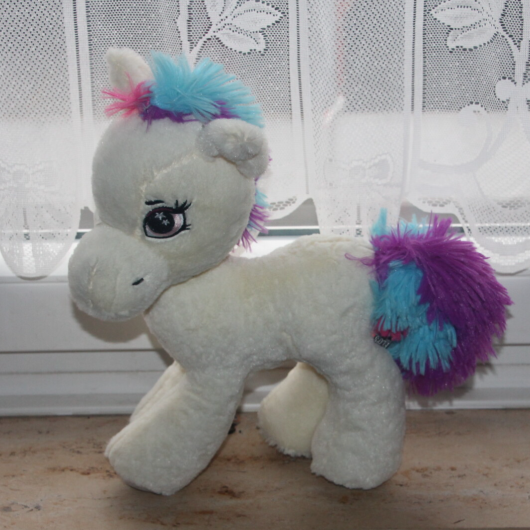 Neuwertiges großes nie bespieltes Plüschpony in weiß mit blau violetten Schweif und Schwanz