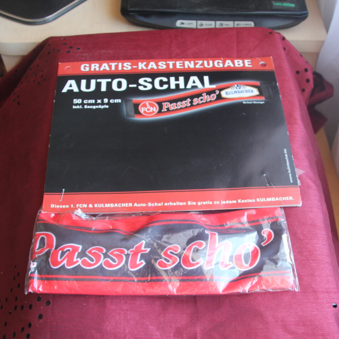 Neuer verpackter Autoschal für die Rückscheibe. Passt scho. Seidenschal mit Saugnäpfen zum Festmachen