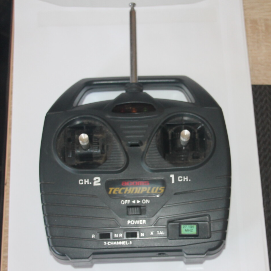 Gebrauchte voll funktionsfähige Fernsteuerung von acoms Techniplus 2 Channel 27.195 MHZ aufladbar aber ohne Kabel, kleiner runde Aufladbuchse. Vor dem Einsetzen von jemanden ausprobieren lassen der Modellflugzeuge baut. Beim Einschalten leuchten oben drei Lampen rot orange grün.