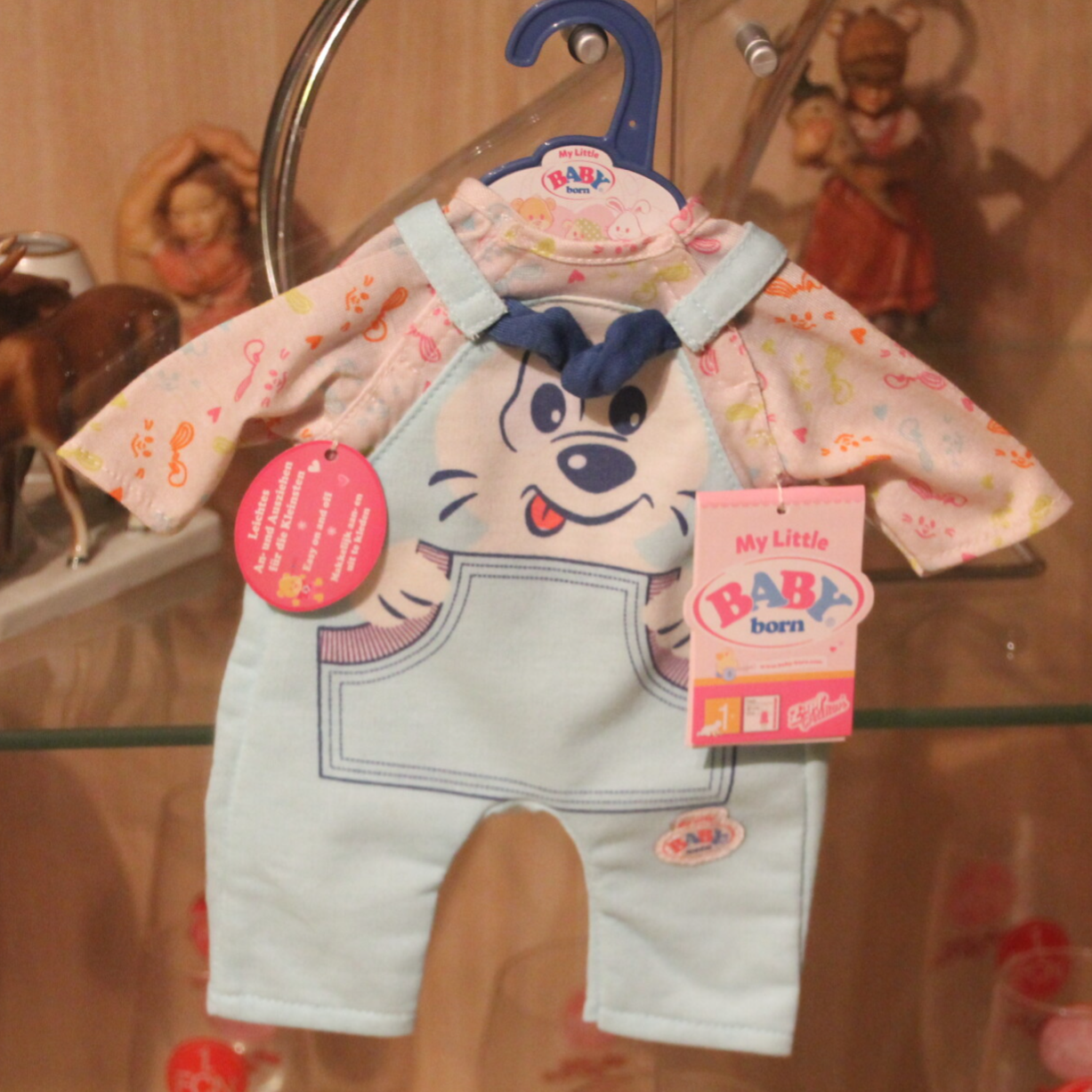 Neue auf Kleiderbügel aufgehangene Baby Born Kleidung für Puppen bis 32 cm. Hellblaue Latzhose und Shirt von Zapf Creation