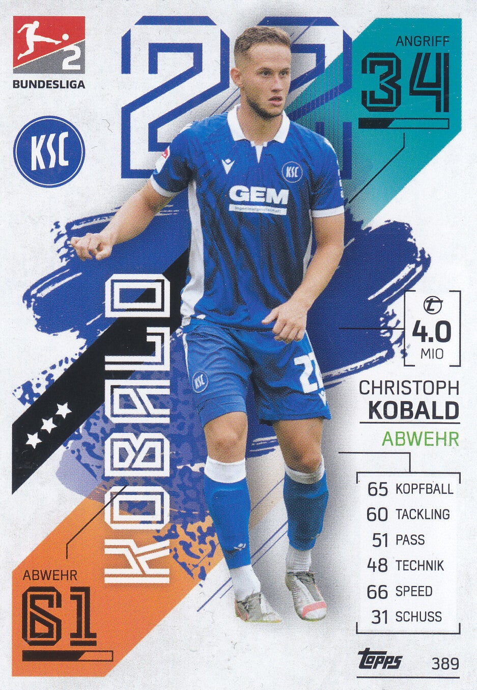 Christoph Kobald / Karlsruher SC / Topps Match Attax 2021 / Basis Karte / Nr. 389